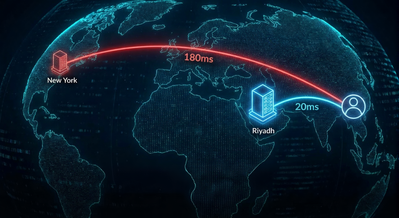 تخيل أن موقعك مستضاف في سيرفر في أمريكا (نيويورك)، وزائرك في الرياض. عندما يطلب الزائر فتح الموقع، يجب أن تسافر الإشارة الضوئية عبر كابلات بحرية لمسافة تزيد عن 10,000 كم ثم تعود. هذا يستغرق وقتاً (يُقاس بالميلي ثانية – ms).